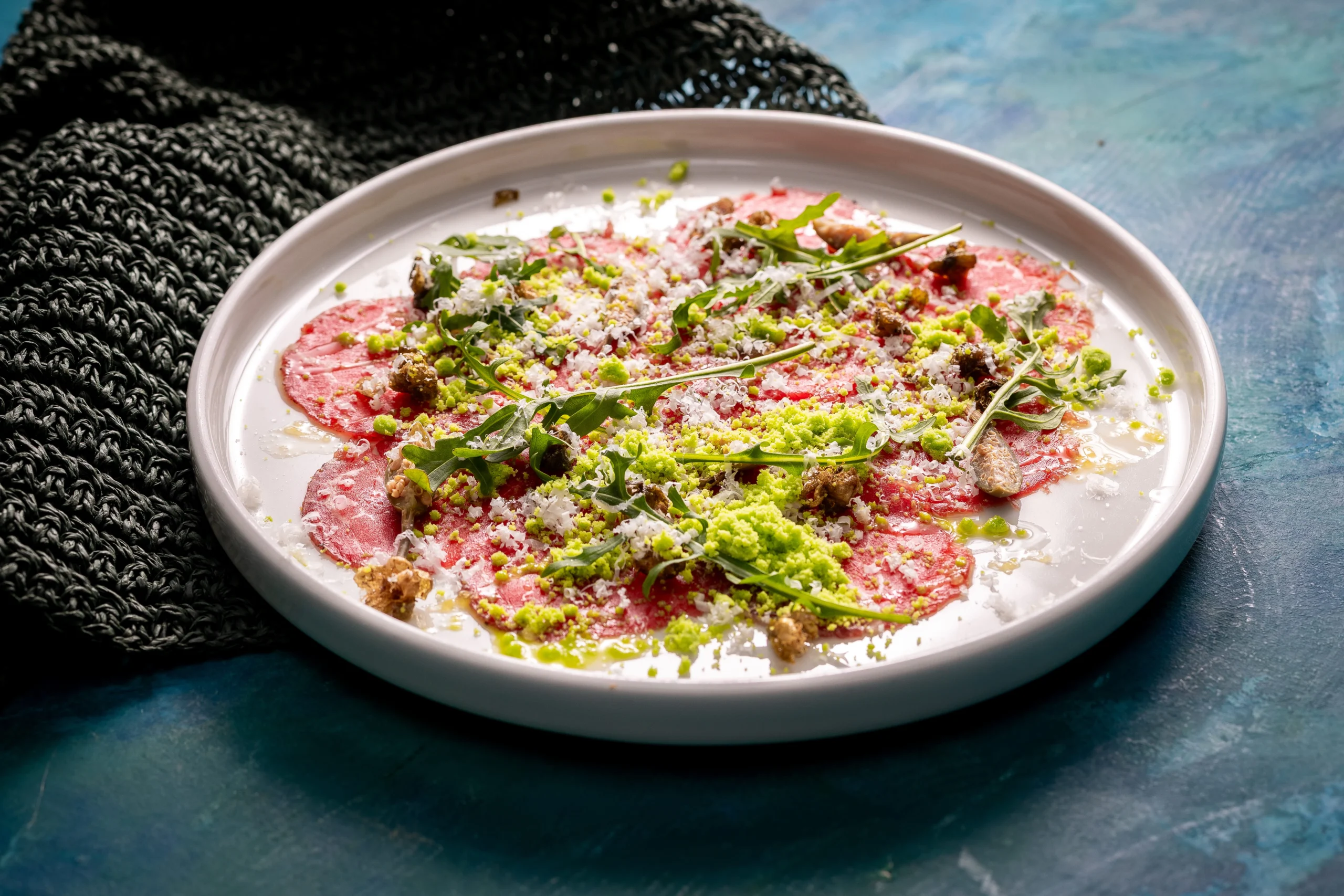 Vékonyra szeletelt bélszín, yuzuval ízesített majonéz, kapribogyó, rukkola, szarvasgombaolaj és parmezán. Elegáns és kifinomult választás.