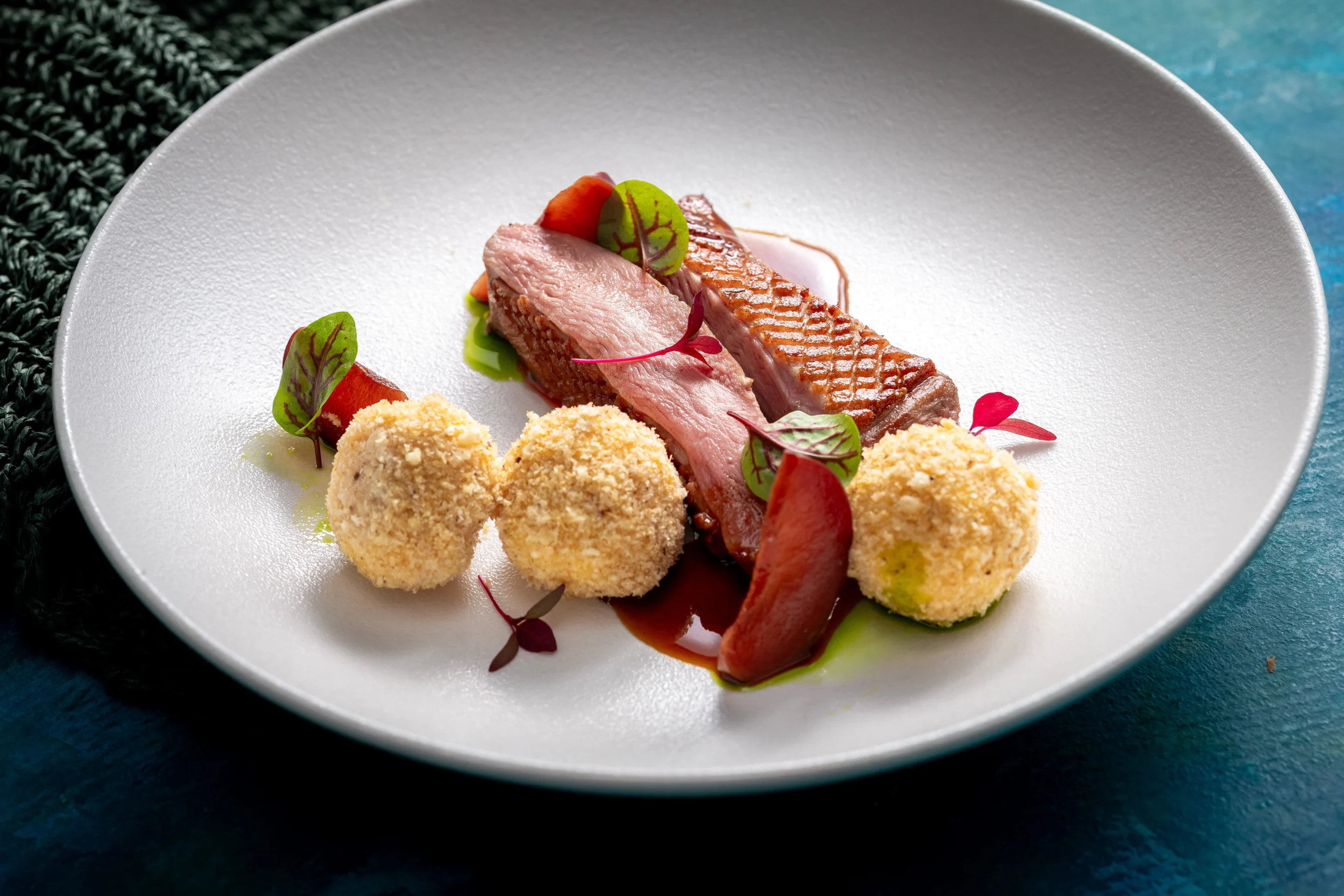 Szaftos kacsamell, sós túrógombóc, savanyított japán szilva és gazdag jus. Harmonikus kontrasztok és izgalmas textúrák.