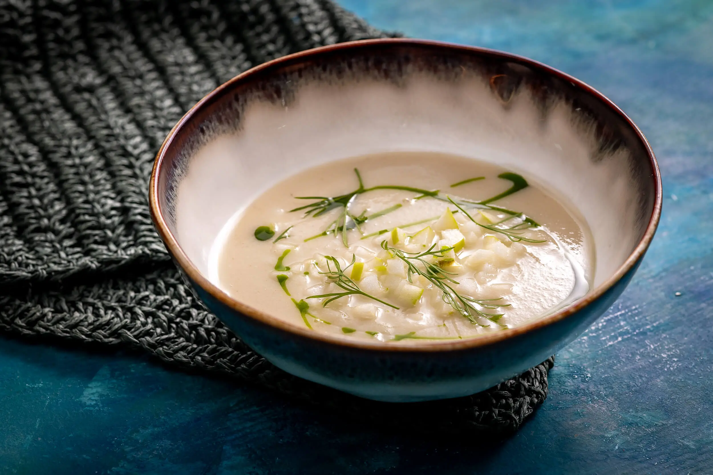 Selymes karalábékrémleves zöldalmával és friss kaporral. Üde, tiszta ízek.