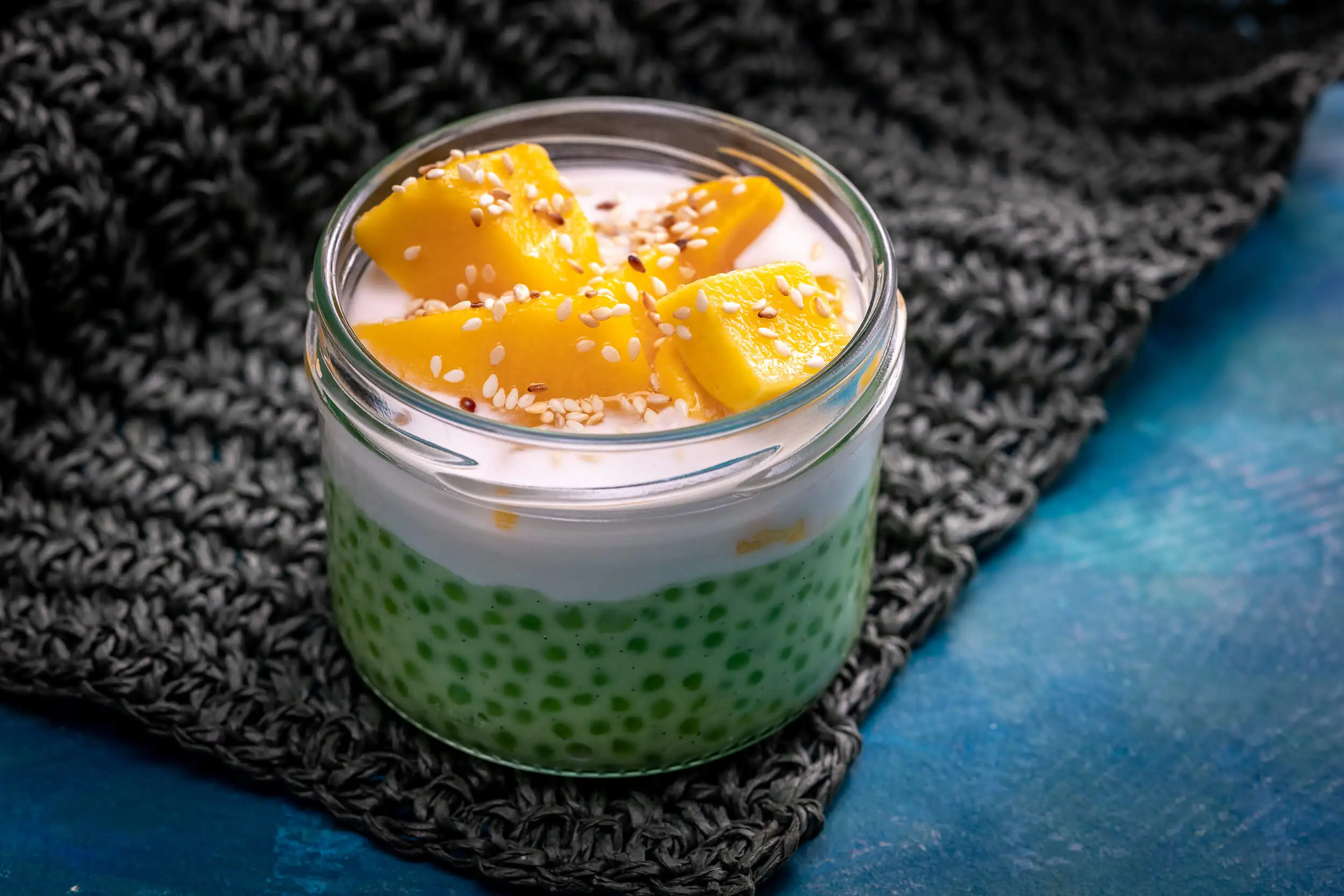 Tápiókapuding házi sűrített kókusztejjel, friss mangóval és pirított szezámmaggal. Könnyed, friss lezárás.