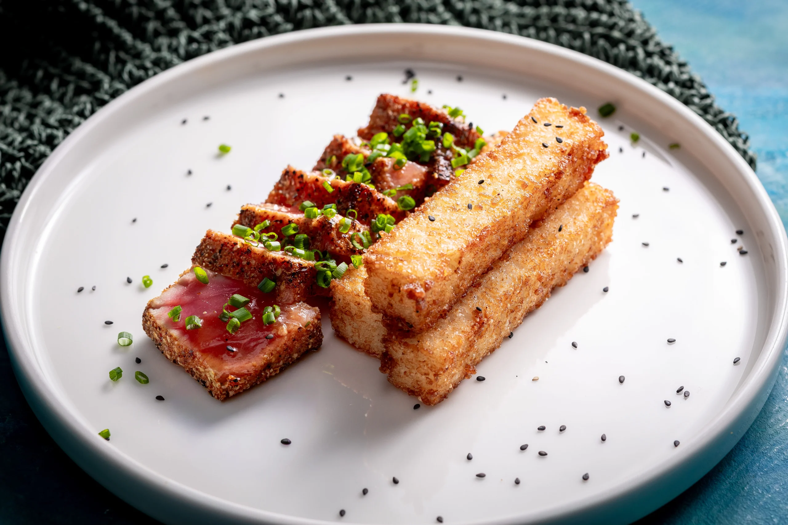 Szezámmagba forgatott tonhalsteak, illatos sushi rizs és teriyaki szósz. Letisztult, kortárs fogás.